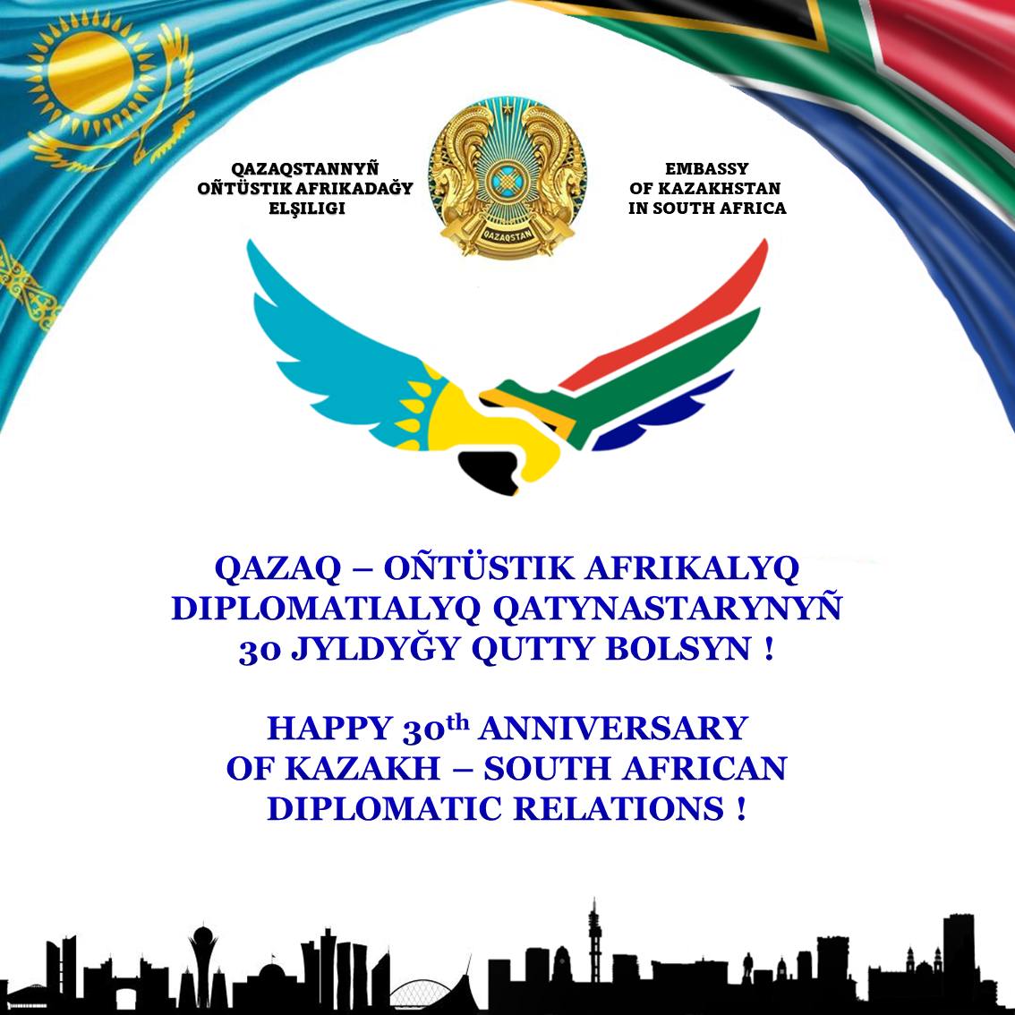 ๐ง๐๐ต๐๐ฎ๐ป๐ฒ (๐ฃ๐ฟ๐ฒ๐๐ผ๐ฟ๐ถ๐ฎ) – ๐๐ผ๐ต๐ฎ๐ป๐ป๐ฒ๐๐ฏ๐๐ฟ๐ด, ๐ฑ ๐ ๐ฎ๐ฟ๐ฐ๐ต ๐ฎ๐ฌ๐ฎ๐ฎ. Kazakhstan and South Africa today celebrate the 30th Anniversary, the Pearl Jubilee of their friendship. Yet, they established full-fledged diplomatic relations on 5 March 1992.